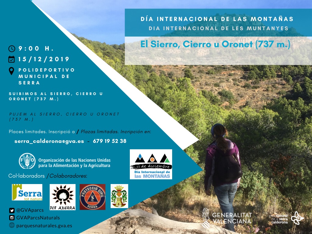 El proper 15 de desembre de 2019 està programada una ruta senderista circular al Sierro per a celebrar el dia internacional de les muntanyes. El Sierro (737 m), és un cim emblemàtic de Serra i lloc de pas entre el Camp del Túria, Camp de Morvedre i L’Alt Palància. Recorrerem antics camins i gaudirem d’unes excel·lents vistes panoràmiques de les muntanyes de València i Castelló.